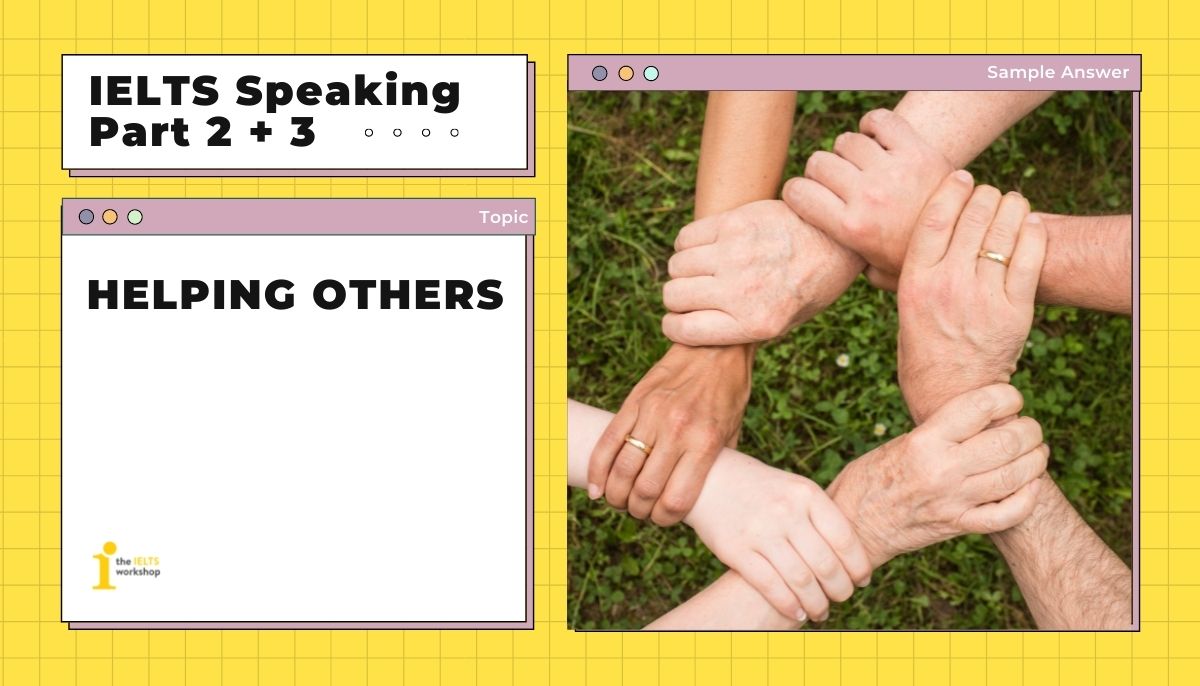 Với chủ đề “Helping Others” (Giúp đỡ) trong IELTS Speaking, thí sinh có thể gặp 1 số dạng câu hỏi như “Describe a time you helped someone” hoặc “Describe a time you helped a friend” tại Part 2. Sau đó, thí sinh sẽ cùng giám khảo thảo luận sâu hơn về 1 số vấn đề xoay quanh chủ đề này trong Part 3. Bài viết dưới đây sẽ phân tích và đưa ra gợi ý câu trả lời, cũng như các từ vựng và cách diễn đạt ăn điểm về Helping others trong IELTS Speaking Part 2 + 3 cho các bạn.