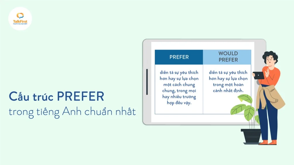 Trong bài học hôm nay, TalkFirst sẽ gửi đến bạn cách phân biệt, công dụng, các cấu trúc và bài tập xoay quanh ‘prefer’ và ‘would prefer’ – hai (cụm) từ được sử dụng thường xuyên để nói về sự chọn lựa hay yêu thích hơn!